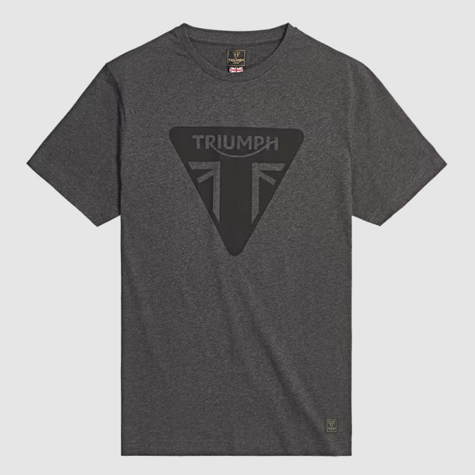 Classic 100% cotton Black tee featuring high-quality Official Triumph logo in White and new signature Triumph-branded woven badge towards the lower hem.